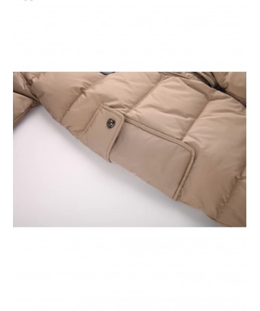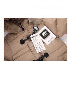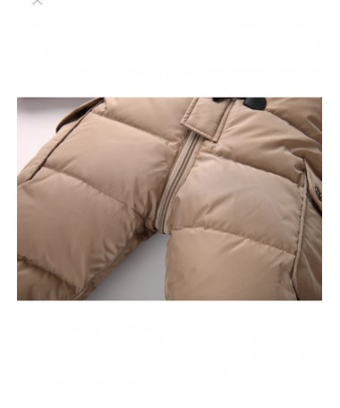 Combinezonul de iarna este umplut 100% cu pene si puf de rata ceea ce asigura comfortul termic al copilului.Gluga are ca accesoriu blana naurala de raton ceea ce ofera un design deosebit.Combinezonul poate fi folosit la sporturile de iarna cat si la joaca in zapada fara ca cel mic sa se ude, se inchide cu fermoar si are mansete la maini si la picioare pentru a nu patrunde frigul sau zapada.